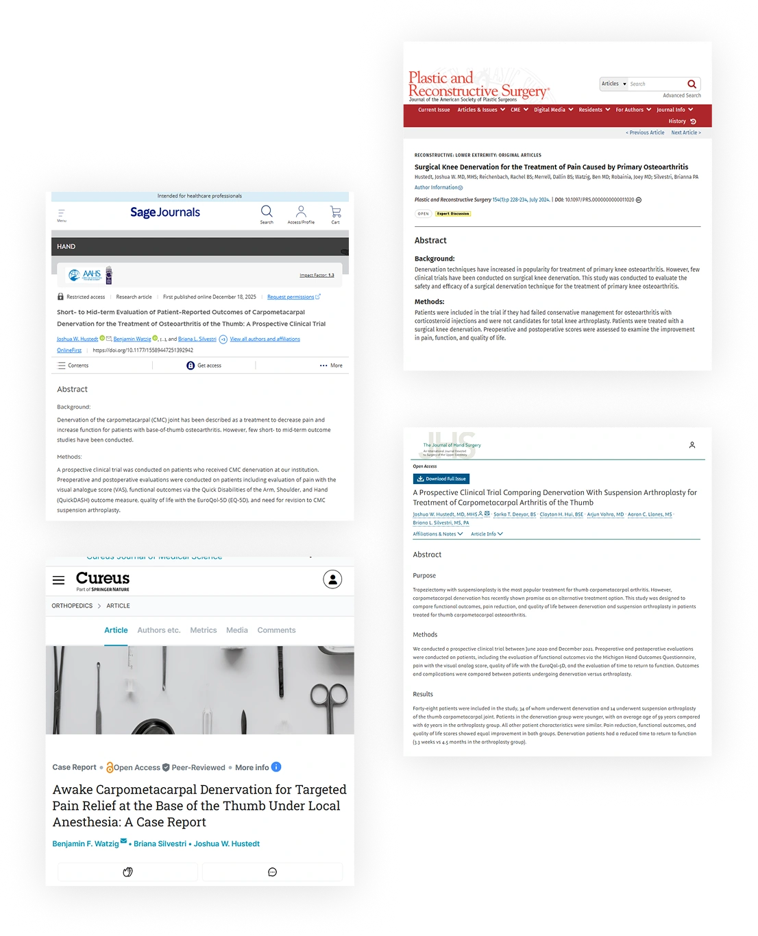 The Nervexa™ treatment approach is built on groundbreaking research led by Dr. Joshua Hustedt while at the University of Arizona. Over years of dedicated clinical research, Dr. Hustedt developed and refined these advanced nerve-based techniques and proved their safety and effectiveness through rigorous clinical trials across multiple joints and patient populations.